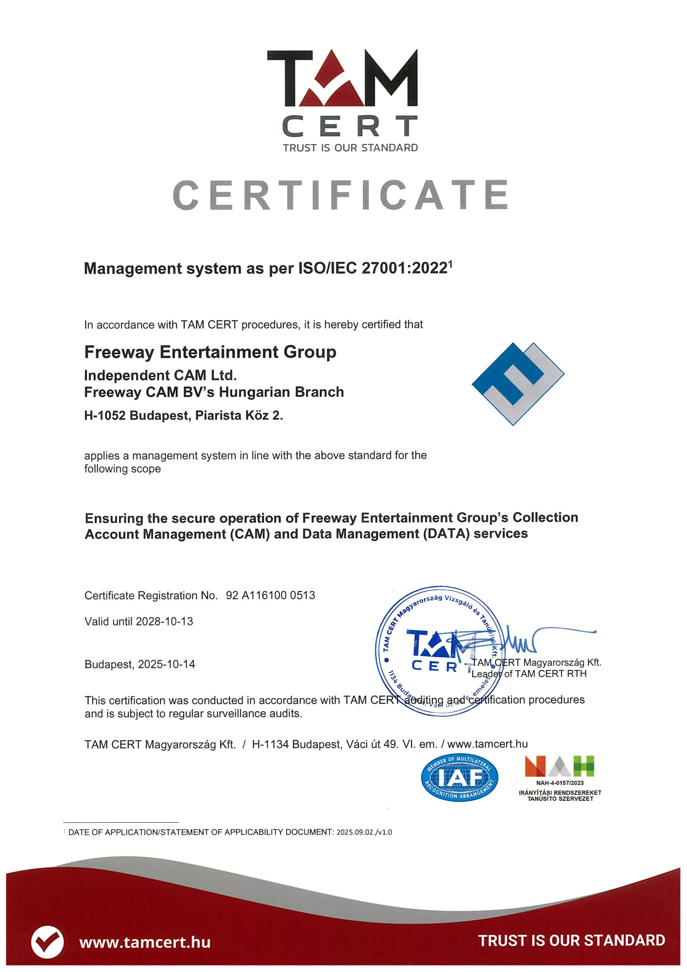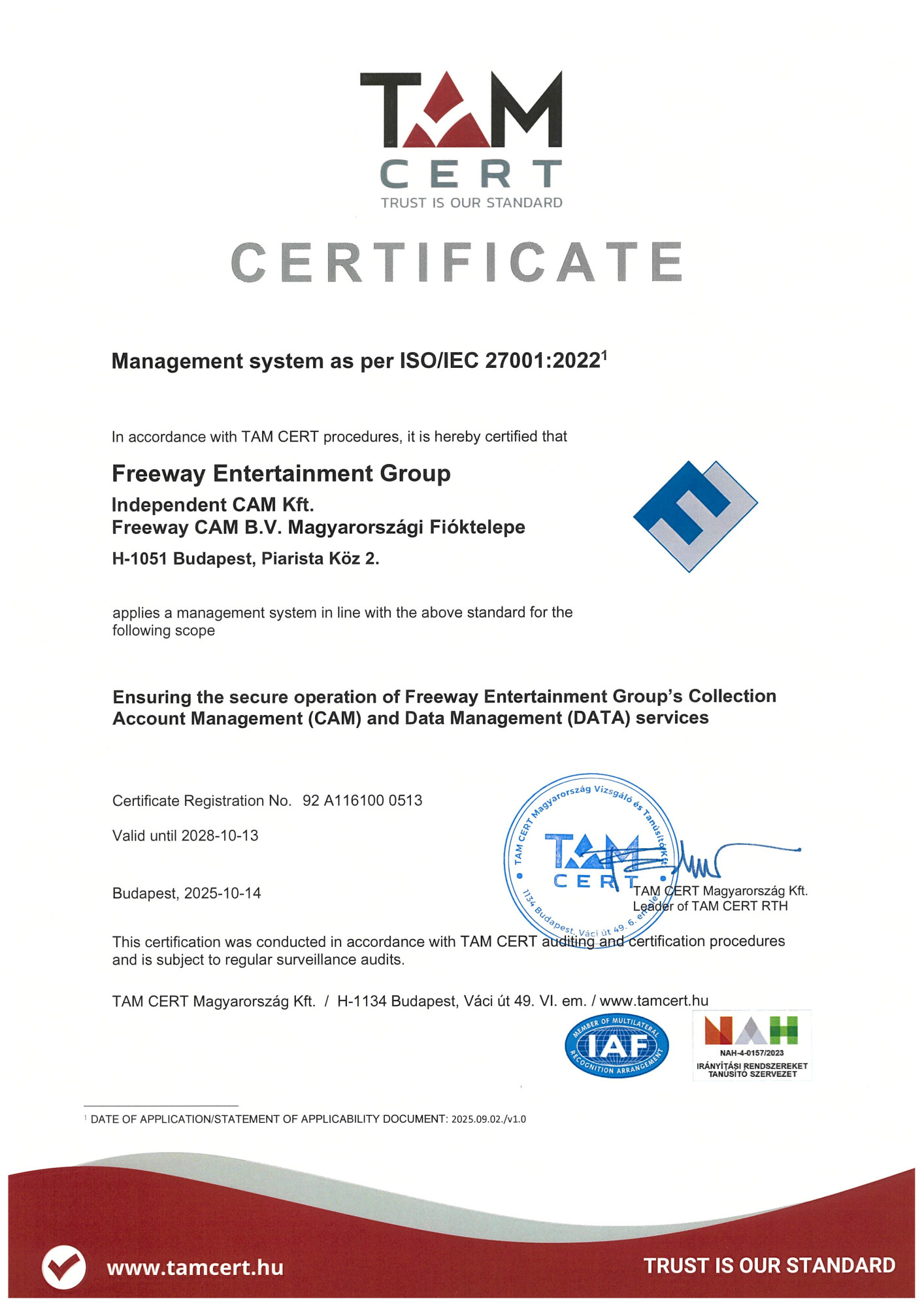 Freeway Entertainment is proud to announce that it has achieved ISO/IEC 27001:2022 certification in October 2025, the internationally recognized standard for information security management systems (ISMS), following a successful audit by TAM CERT.